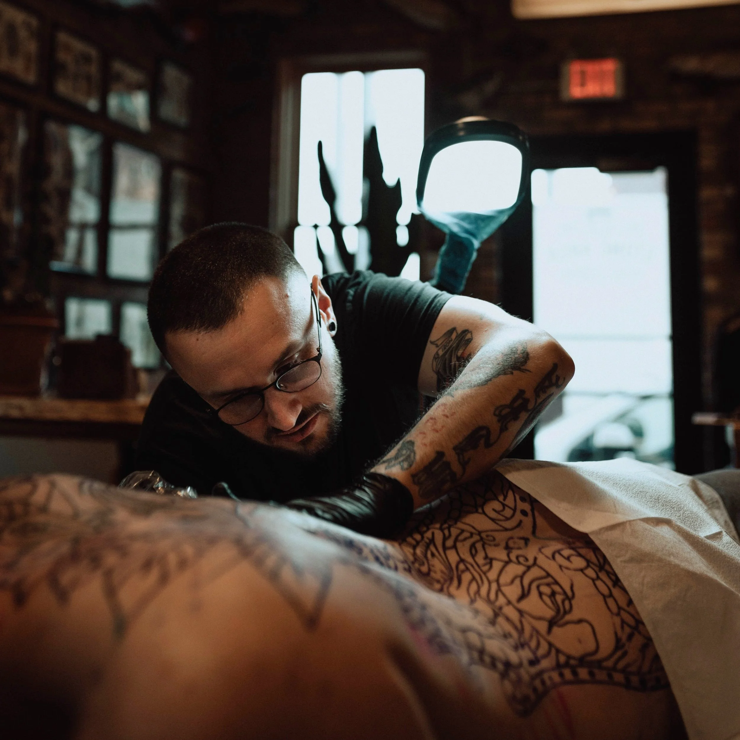 I draw my inspiration from the work of traditional tattooers who came before me, and themes of hermeticism, alchemy, eastern religions, medieval imagery, cosmic horror, and the occult.